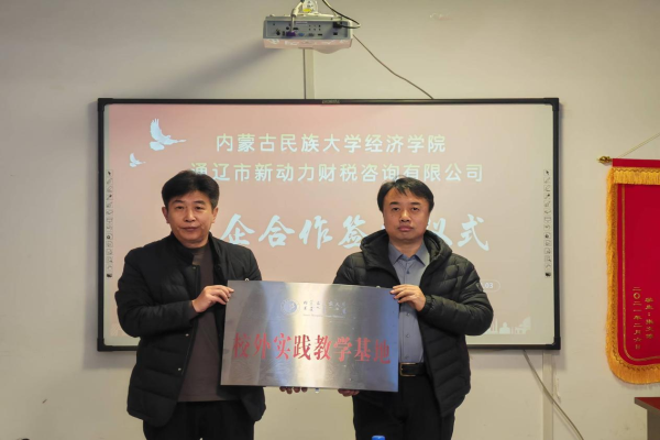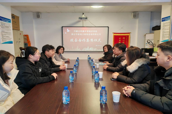 为加强学院与企业之间的紧密联系,推动校企协同育人建设,进一步提升人才培养质量,12月3日,经济学院与通辽市新动力财税咨询有限公司举办了校外实践教学基地签约挂牌仪式。经济学院党委书记刘力国、副书记李红云、副院长赵欣、财务管理系主任包乌日汉、辅导员白洋以及教学科研办周小惠出席本次仪式。