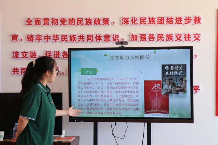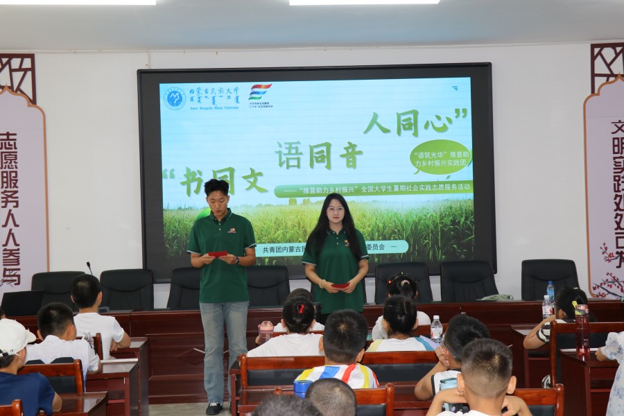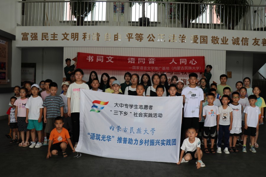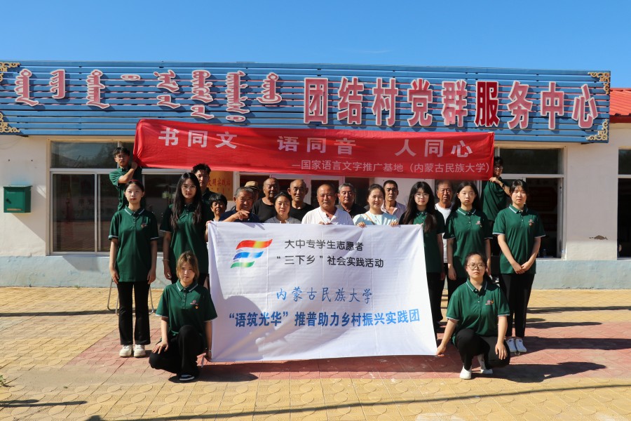 为推广普及国家通用语言文字,服务铸牢中华民族共同体意识,推进乡村振兴事业发展,7月29—30日,国家语言文字推广基地(内蒙古民族大学)——经济学院“语筑光华”推普助力乡村振兴实践团赴库伦旗开展推普助力乡村振兴社会实践活动。指导老师朝木力格带领14名学生参加本次活动。