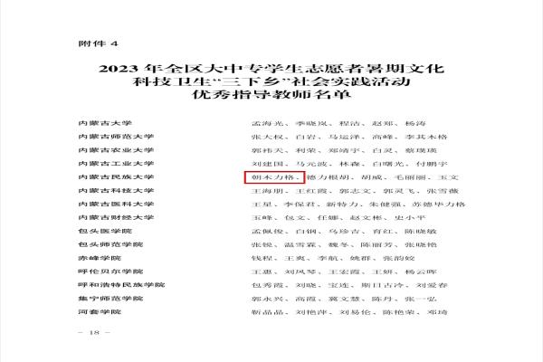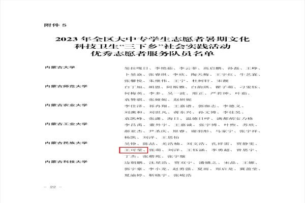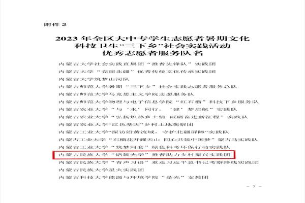 近日,内团联发〔2023〕27 号《关于表彰2023 年全区大中专学生志愿者暑期文化科技卫生“三下乡”社会实践活动先进集体和优秀个人的决定》,我院“语筑光华”推普助力乡村振兴实践团获得优秀志愿者服务队称号;团总支书记朝木力格老师获得优秀指导教师称号;王可莹同学获得优秀志愿者服务队员称号。