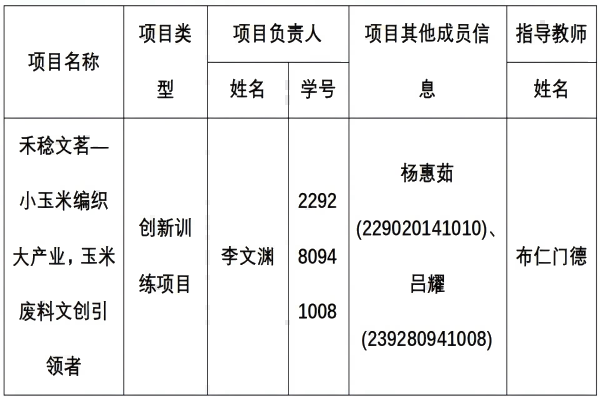 按照教育厅《关于开展2024年国家级和自治区级大学生创新创业训练计划立项和结题验收工作的通知》要求,全区19所本科高校上报了2024年国家级和自治区级大学生创新创业训练计划项目,创新训练项目547项,创业训练项目61项,创业实践项目42项。我院学生积极参加并荣获佳绩,其中,22级经济与金融专业李文渊同学的项目《禾稔文茗—小玉米编织大产业,玉米废料文创引领者》获国家级立项。