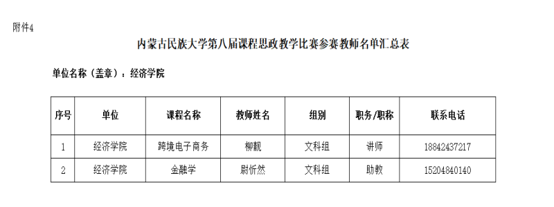为深入贯彻落实立德树人根本任务,充分发挥课程思政示范引领作用,经济学院积极响应学校号召,组织教师参加内蒙古民族大学第八届课程思政教学比赛。经教师自主申报、学院评审,现将参赛名单予以公示,公示期自即日起3个工作日。公示期间,如对参赛教师资格有异议,请向学院教学科研办公室(至善楼304)反映。