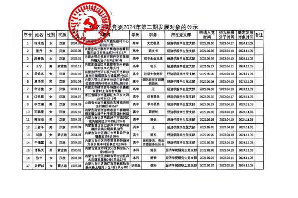 按照《中国共产党发展党员工作细则》《内蒙古民族大学发展党员工作实施细则》规定的程序和标准,经支部委员会研究确定拟发展对象人选,报经济学院党委充分讨论通过后,确定以下人员为党员发展对象,公示如下: