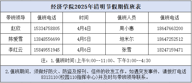 经济学院2025年清明节假期值班表